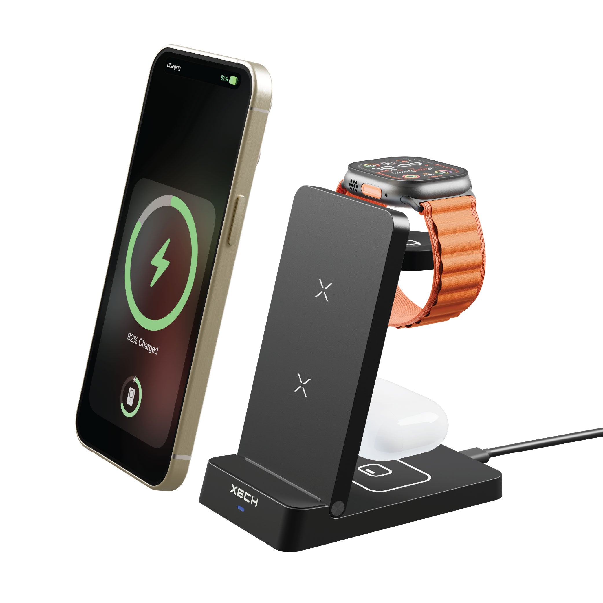 The XECH Powerbase MAX is a sleek 3-in-1 foldable wireless charging station that powers your smartphone, earbuds, and smartwatch at the same time. With Qi fast charging up to 15W and auto device detection, it delivers optimal speed for every device. Its compact, foldable design makes it perfect for travel, while the USB-C input ensures universal compatibility. Use your phone in vertical or horizontal mode while charging. Built-in advanced safety features like Over-current, Over-voltage, Over-temperature, Short-circuit & Foreign Object Detection guarantee safe, reliable charging every time.