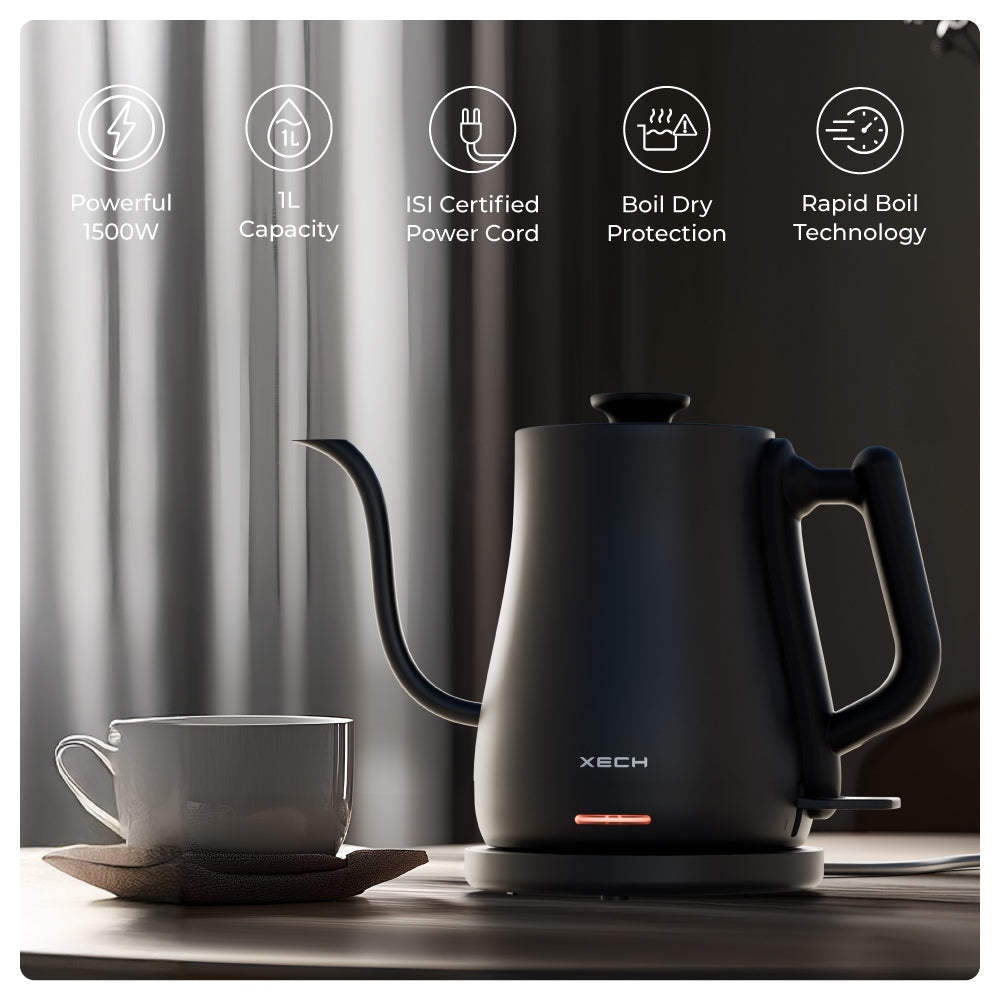 The ideal hot water tea kettle for pour-over coffee lovers and tea enthusiasts. Featuring a 1L stainless steel body, controlled flow spout, and a counterbalanced handle, this water boiler is perfect for modern kitchens, offering precise brewing and rapid heating for your daily needs.