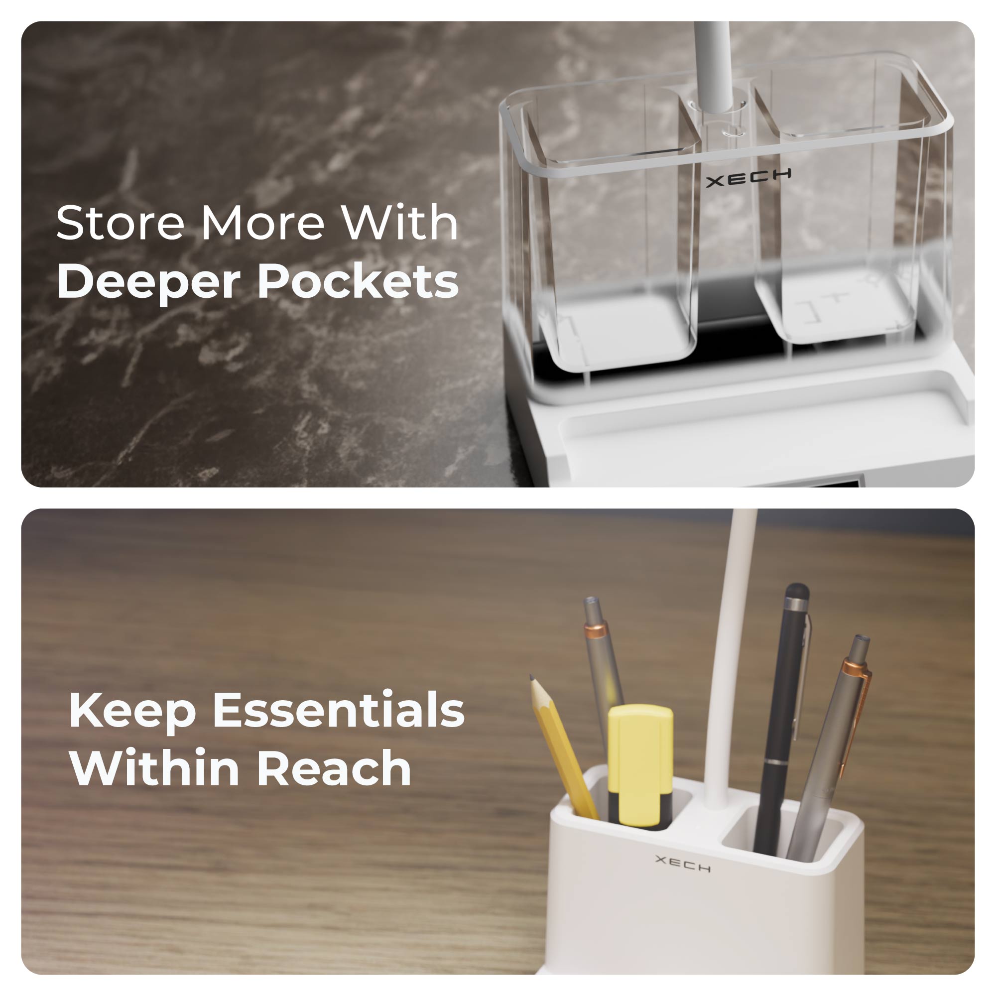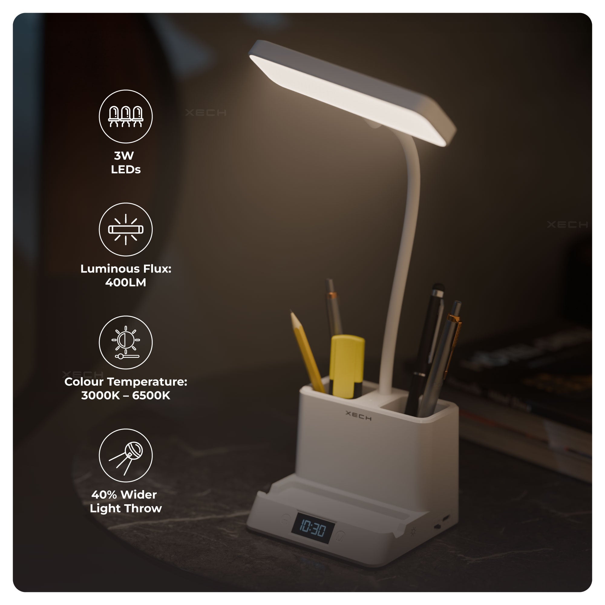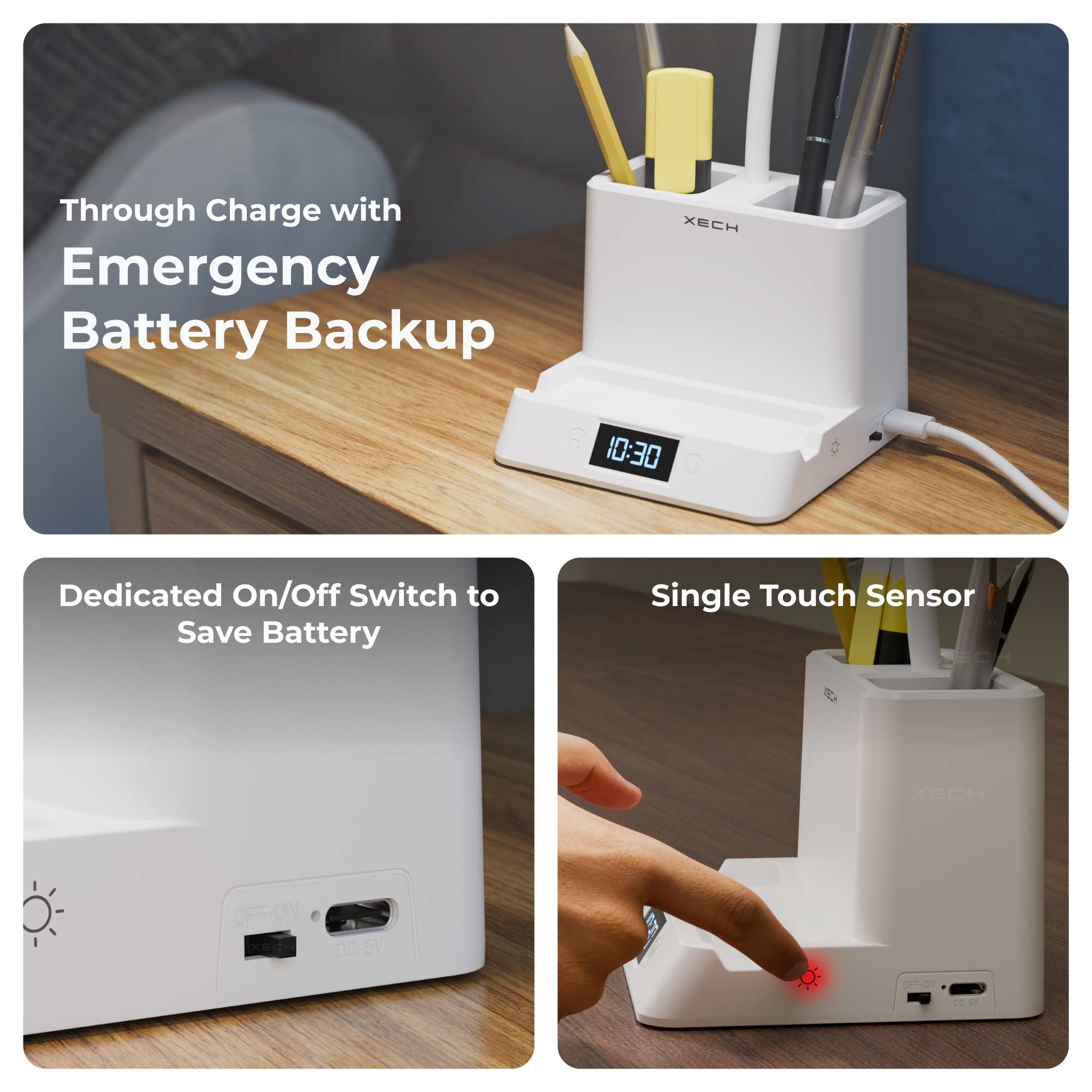 Always losing track of time while working or studying? The XECH 4-in-1 Desk Lamp keeps you focused and punctual with its built-in digital clock, right on your desk where you need it most. No more checking your phone and getting distracted, just a quick glance keeps you on schedule. Along with timekeeping, it gives you glare-free lighting with 3 color tones, dual compartment desk organizer to beat clutter, and a phone holder for hands-free use. The rechargeable battery with through-charge support ensures the lamp stays on even during power cuts, making it your most reliable desk partner.