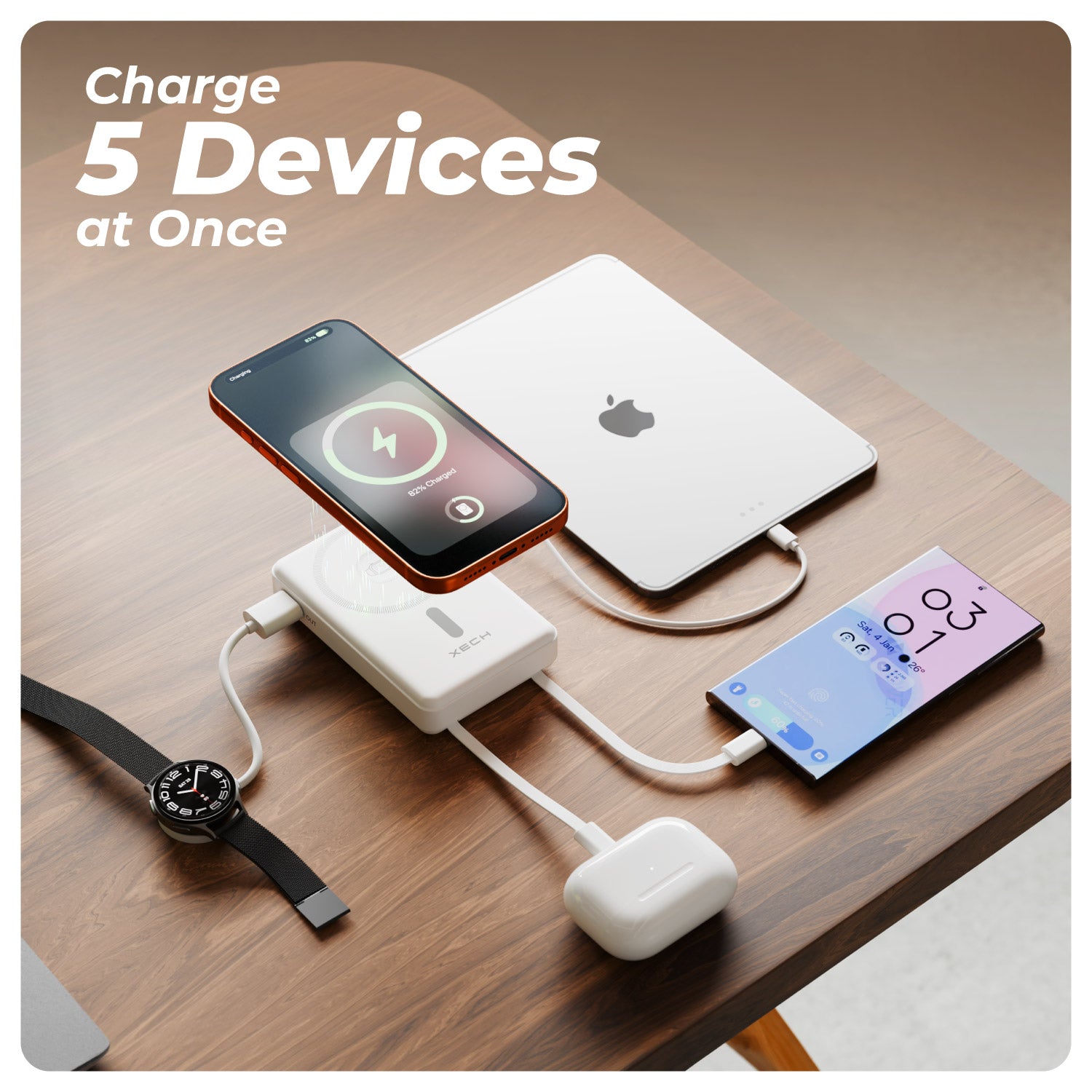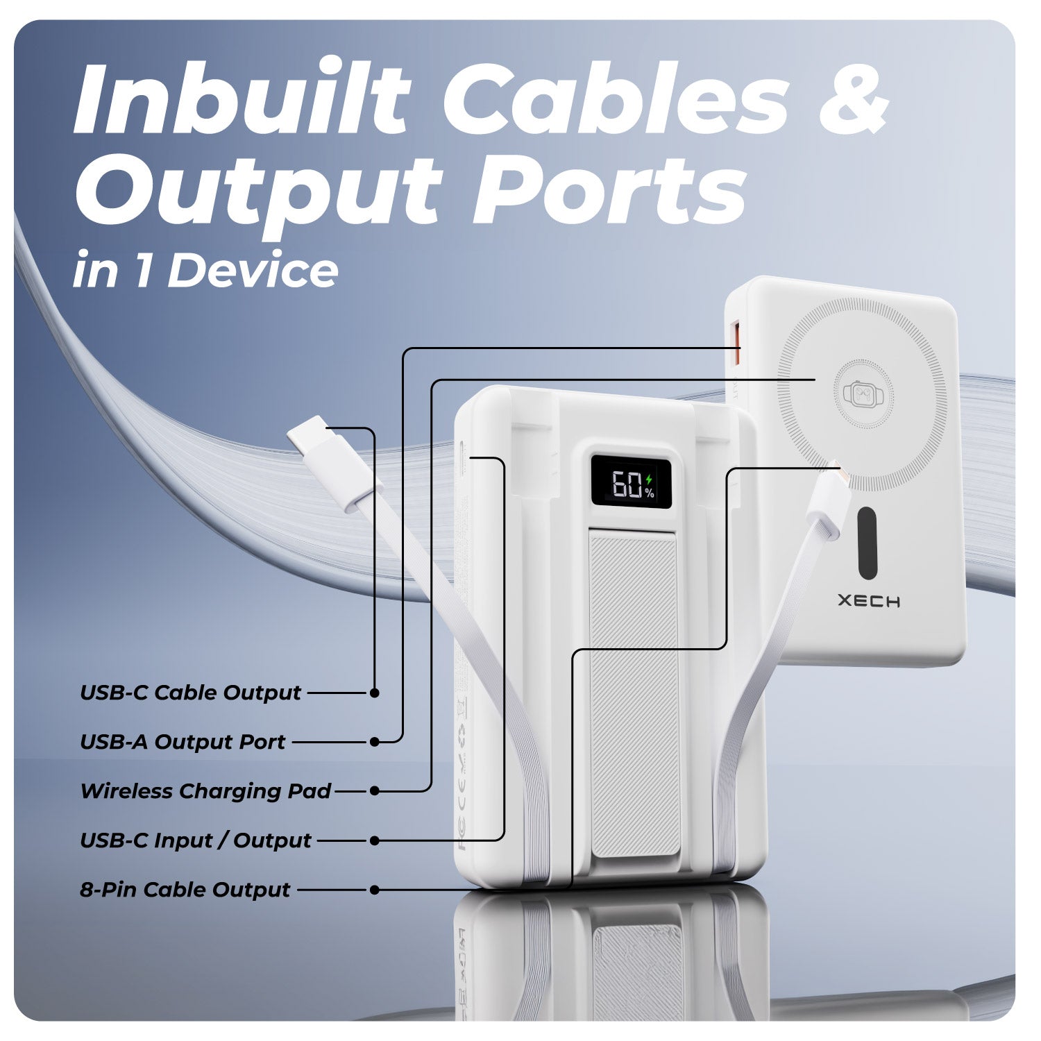 5-in-1 Charging: Charge wirelessly plus two built-in cables and two USB outputs—perfect for multitasking.