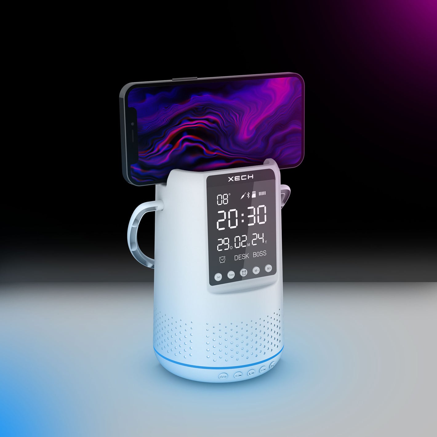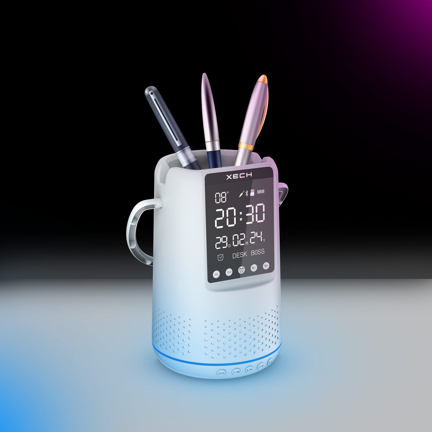 XECH Deskboss is a 6-in-1 hybrid device that combines essential functionalities like a hi-fidelity wireless speaker, alarm clock, smartphone stand, pen stand, stationery holder, and ambient RGB lights. Its multifunctionality, superior audio quality, and sleek design set it apart from traditional desk accessories.