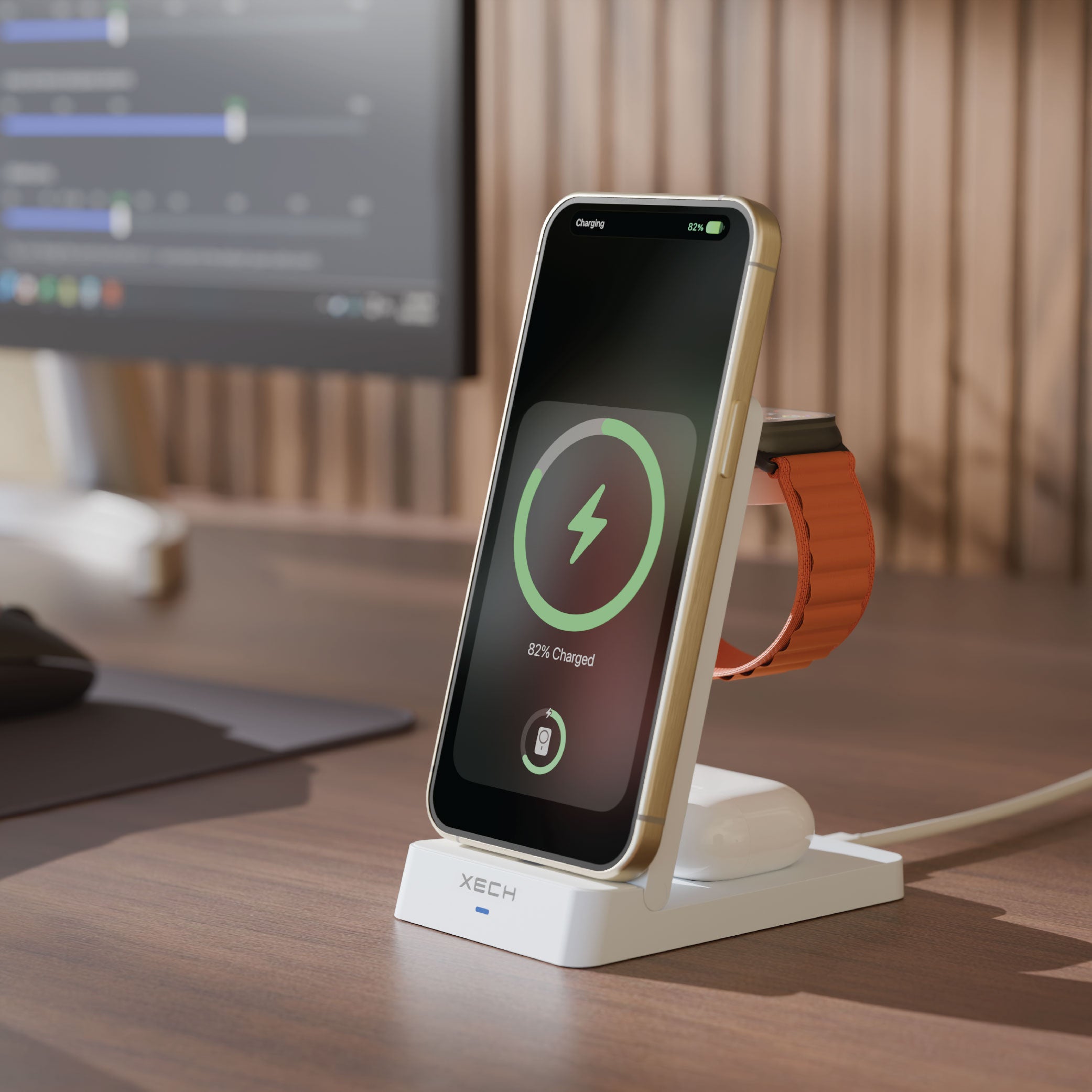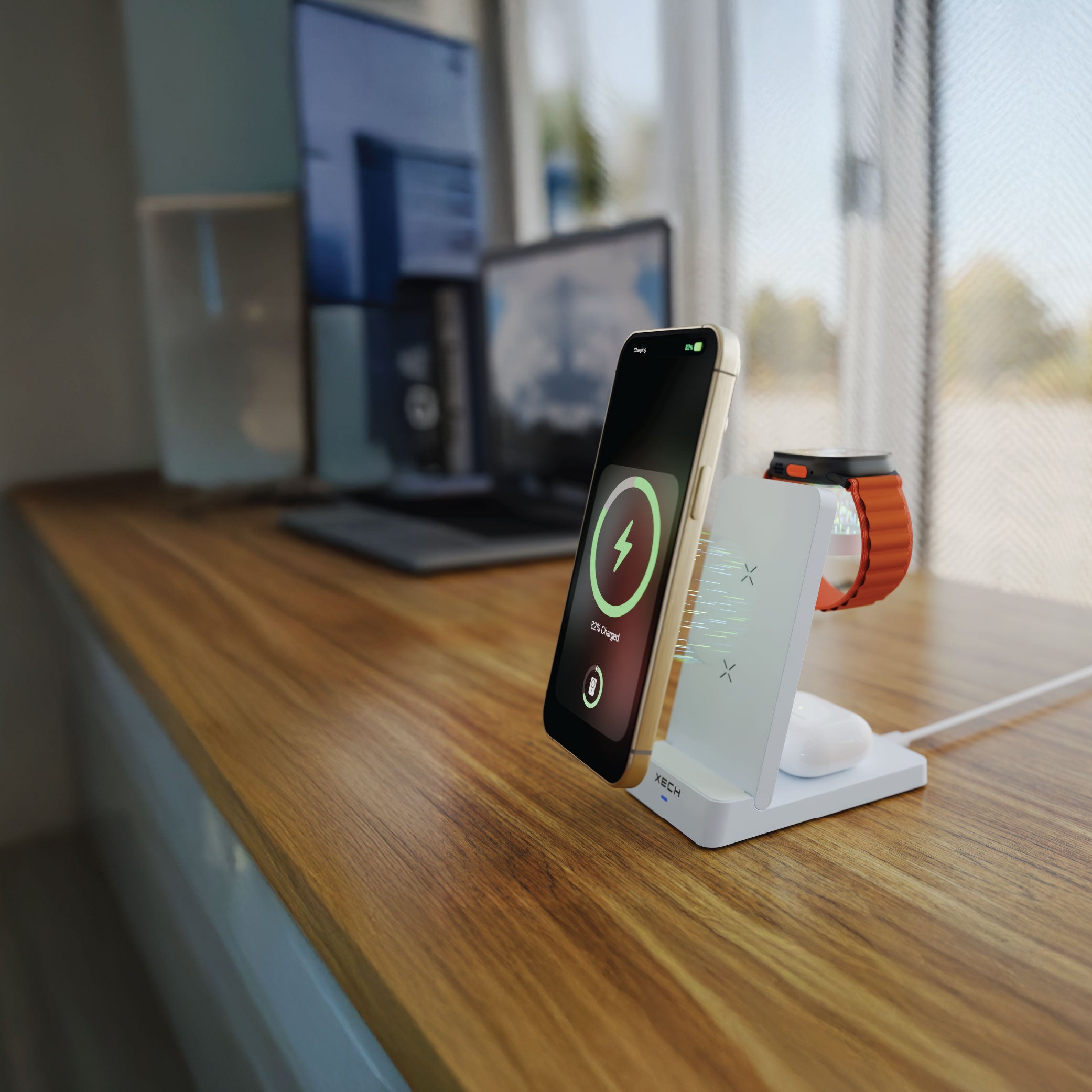 The XECH Powerbase MAX is a sleek 3-in-1 foldable wireless charging station that powers your smartphone, earbuds, and smartwatch at the same time. With Qi fast charging up to 15W and auto device detection, it delivers optimal speed for every device. Its compact, foldable design makes it perfect for travel, while the USB-C input ensures universal compatibility. Use your phone in vertical or horizontal mode while charging. Built-in advanced safety features like Over-current, Over-voltage, Over-temperature, Short-circuit & Foreign Object Detection guarantee safe, reliable charging every time.