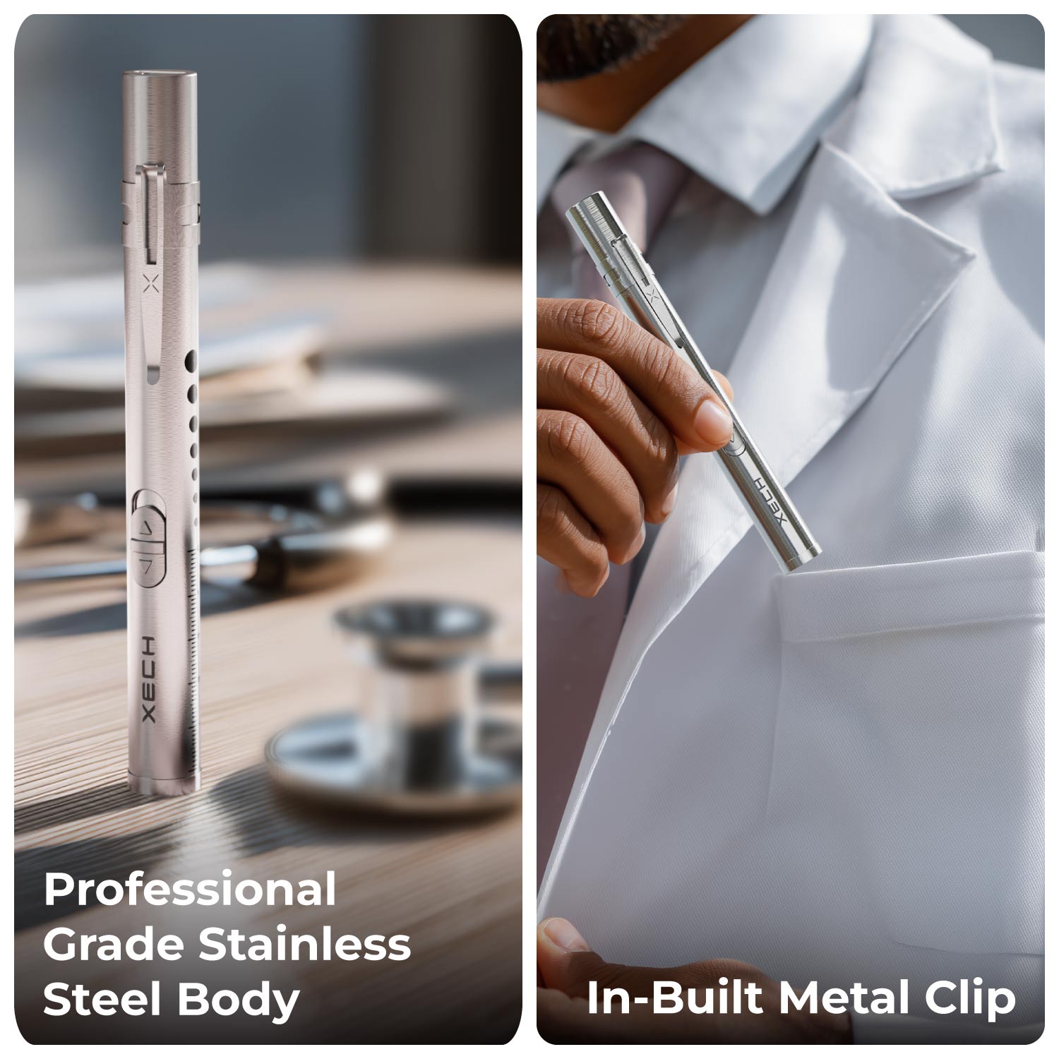 TorchX is a premium rechargeable penlight designed for precision, reliability, and everyday convenience. Crafted from rust-free stainless steel, it features dual-mode LEDs — white for clarity, warm for gentle pupil or oral exams. The USB-C rechargeable battery lasts up to two months on a single charge, while its built-in pupil gauge and ruler offer practical utility for medical professionals.