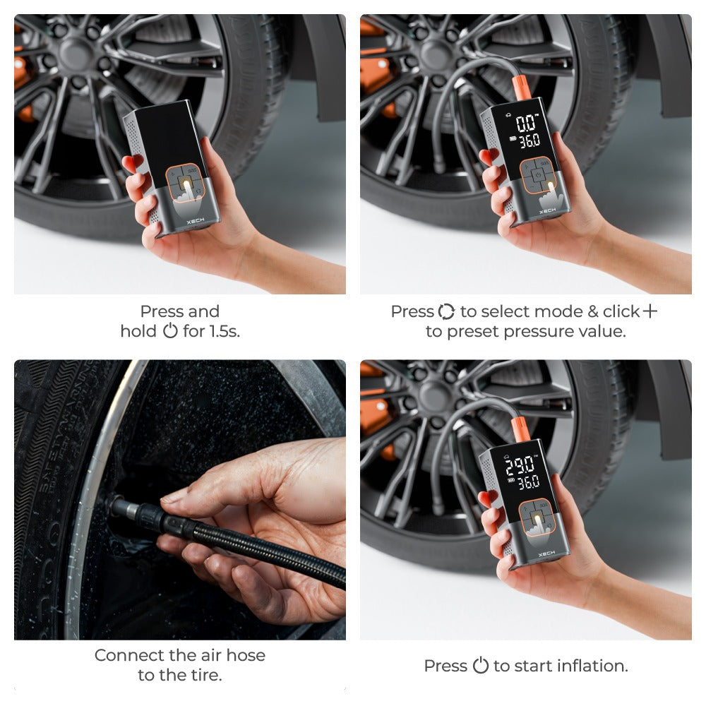 Using the XECH cordless inflator is effortless: select the mode, attach the nozzle, set your desired pressure, and let it inflate. Ideal for cars, bikes, and other inflatables.
