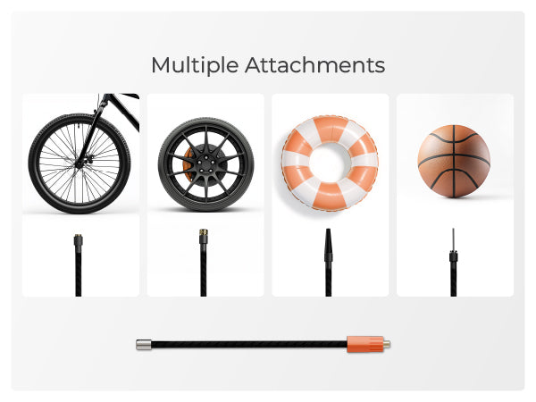 This inflator comes with multiple attachments and hoses for easy inflation of car tires, bike tires, sports balls, and other inflatables. Enjoy seamless versatility for all your needs.