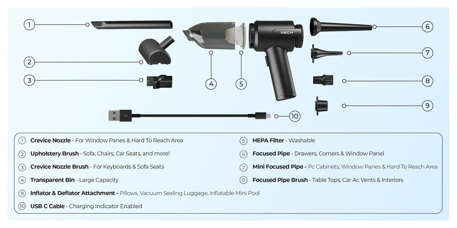 Attachments Included: 1 x Crevice Nozzle | 1 x Mini Brush | 1 x Focused Pipe | 1 x Mini Pipe