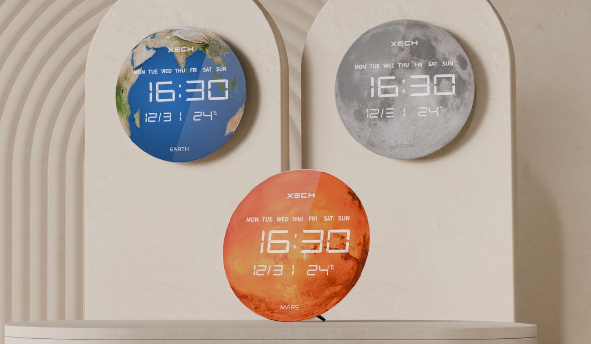 Solaris Plus LED Wall Clock offers versatile functionality for any space. Ideal for living rooms, bedrooms, and office desks, it shows day, date (MM/DD), time, and temperature in an elegant design