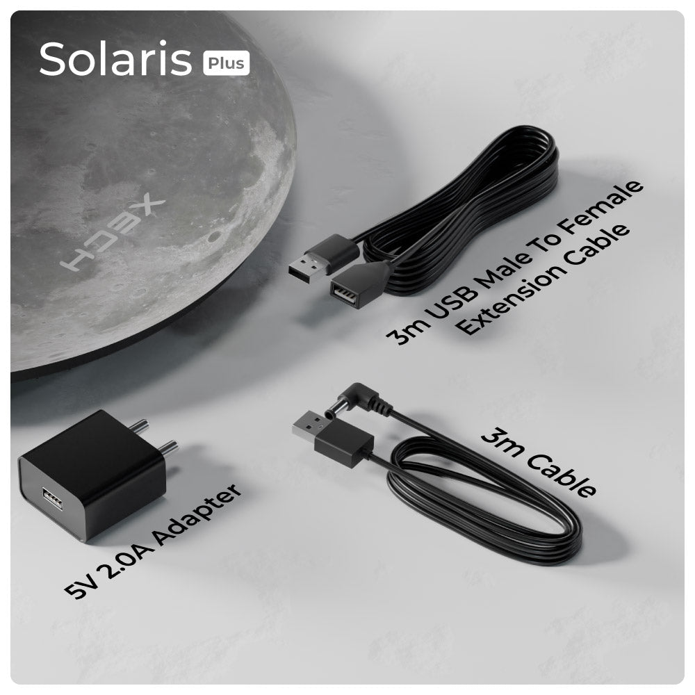 Solaris Plus Comes with a 5V 2A Adapter and the cable length is 1.5 meters (5 ft). It also comes with an adaptor and a 3m Male to Female Extension Cable that allows convenient setup